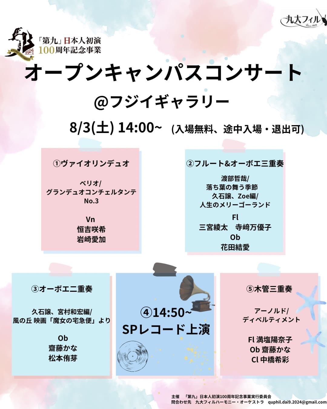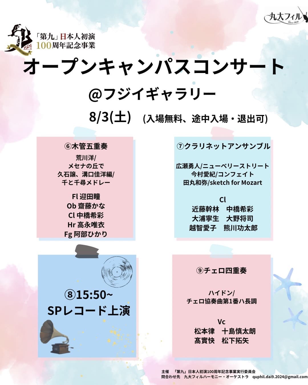 8月3日(土)のオープンキャンパスに合わせて、九大フィルのミニコンサートがフジイギャラリーで開催されます。