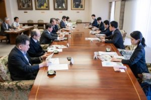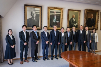 はじめに、石橋総長ら執行部と本学が展望する「総合知で社会変⾰を牽引する⼤学」の理念に基づいた「Kyushu University VISION2030」の取組等について意⾒交換を⾏いました。