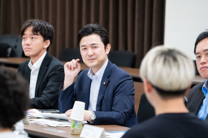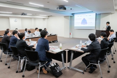 その後、椎木講堂大会議室で博士課程学生への経済支援・キャリア支援を行っている「九州大学 未来を拓く博士人財育成プログラム (K²-SPRING)」、アントレプレナーシップに関する実践的教育・研究を行っている「九州大学ロバート・ファン/アントレプレナーシップ・センター (QREC)」の概要について説明を受け、学生との意見交換を行いました。