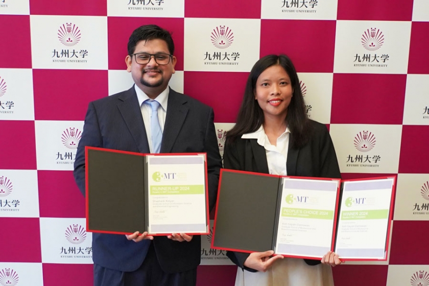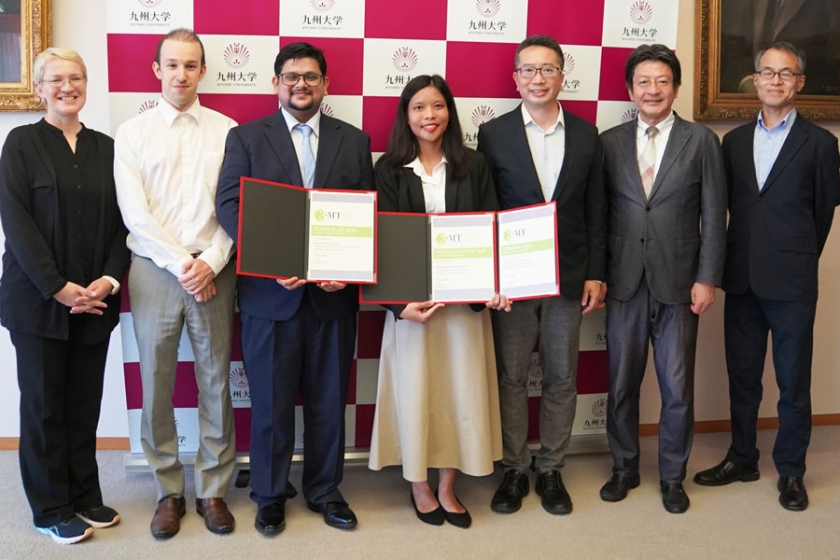 令和6年8月26日(月)に伊都キャンパスの椎木講堂で、Kyushu U 3MT Competition 2024の表彰式を開催しました。表彰式には、受賞者2名のほか、受賞者の各指導教員、岩田理事、許斐副理事、南国際部長が出席しました。