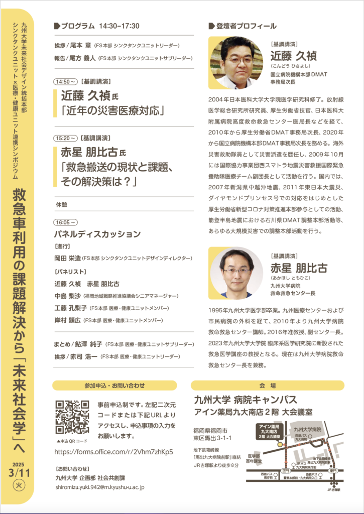 九州⼤学未来社会デザイン統括本部(FS本部)では、シンクタンクユニットと医療・健康ユニットが連携し、2024年4月から「救急車利用の課題・問題を考える」をテーマに勉強会を重ねてきました。