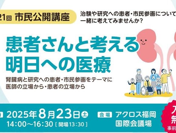 《8/23開催》第21回市民公開講座「患者さんと考える明日への医療」 ~腎臓病と研究への患者・市民参画をテーマに 医師の立場から・患者の立場から~